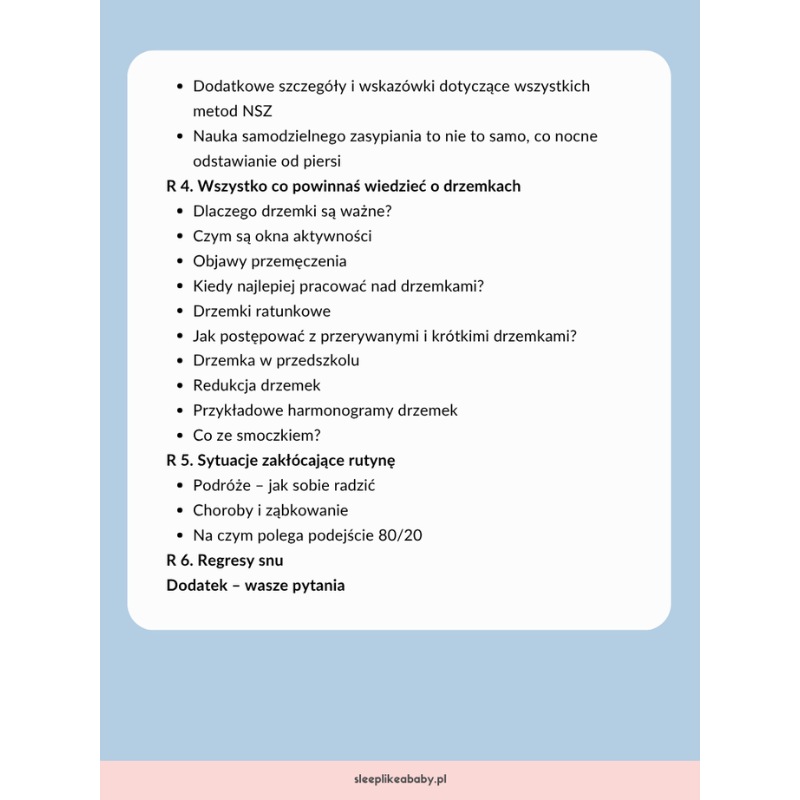 „Nauka Samodzielnego Zasypiania – Krok po kroku” to kompletna baza wiedzy, która pozwala rodzicom nie tylko wiedzieć, co robić, ale przede wszystkim rozumieć, dlaczego to robią. To wiedza, która daje pewność i pozwala działać skutecznie.